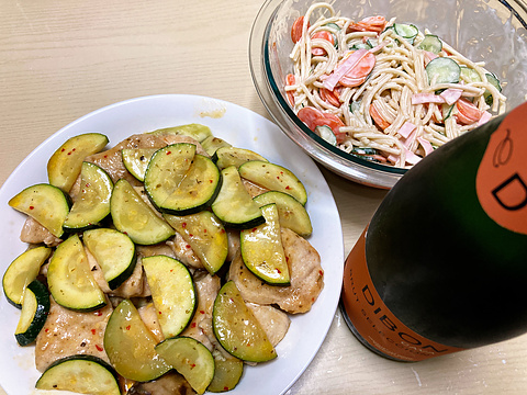 鶏胸肉と蒸しナスとズッキーニのペペロンチーノ、他