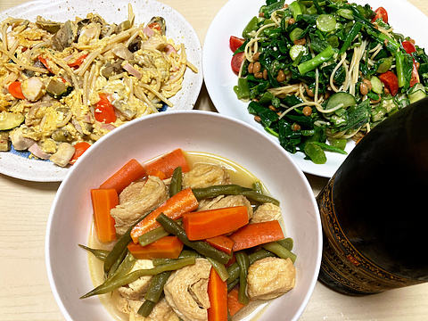 本日のメニューは、上段左から残り物の玉子炒め、緑のスタミナ納豆冷製パスタ、下段が湯葉とインゲンとにんじんの煮物、です。