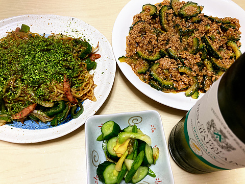 本日のメニューは、上段左からピーマンのソース焼きそば、麻婆ゴーヤ、下段がきゅうりとセロリの浅漬け、です。