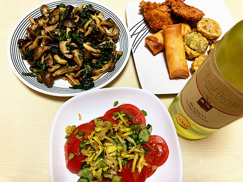 本日のメニューは、上段左からきのことセロリのバターしょう油炒め、揚げ物各種(冷凍品を揚げたもの)、下段がトマトの浅漬けサラダ、です。