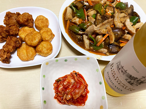 本日のメニューは、上段左からから揚げとチキンナゲット(冷凍品を揚げたもの)、豚トロ麻婆茄子、下段がキムチ漬け(市販品)、です。
