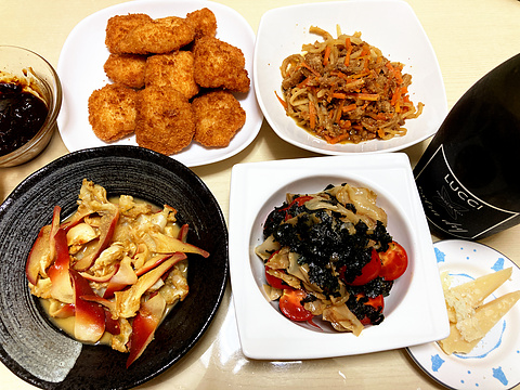 本日のメニューは、上段左からみそチキンカツ、鶏そぼろ入り切り干し大根の煮物、下段左からホッキのバターしょう油炒め、トマトの海苔ザーサイ和え、パルミジャーノレッジャーノ、です。