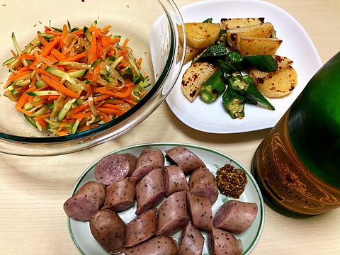 本日のメニューは、上段左から中華クラゲのサラダ、長芋とオクラのバターしょう油ソテー、下段がハーブソーセージ、です。