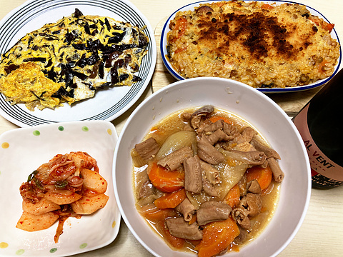 本日のメニューは、上段左からキクラゲの玉子炒め、焼きトマトチーズリゾット、下段左から梨のキムチ和え、もつ煮、です。