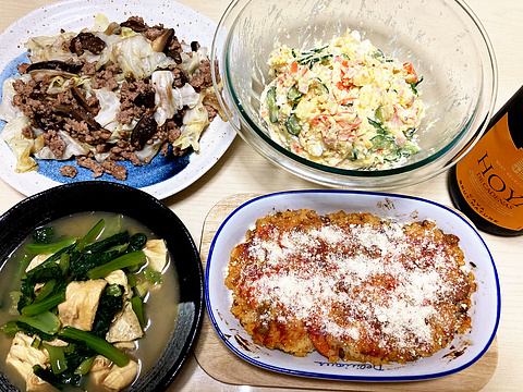 本日のメニューは、上段左からひき肉とキャベツと椎茸の塩炒め、ポテトサラダ、下段左から湯葉と小松菜の煮浸し、焼きリゾット、です。