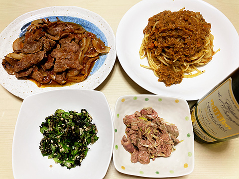 低温調理鶏レバーのネギ和え、他 本日のメニューは、上段左から牛カルビ焼き、カポナータソースのスパゲッティ、下段左からオクラの海苔とろろ昆布和え、低温調理鶏レバーのネギ和え、です。 鶏レバーはやわらかすぎてパテか?と思うほどでした。味はおいしかったです。