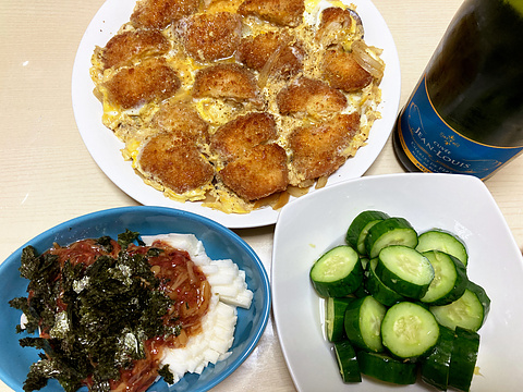 本日のメニューは、上段がチキンカツ煮、下段左から長芋の梅なめ茸和え、きゅうりの浅漬け、です。