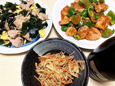 本日のメニューは、上段左から豚肉とワカメの玉子炒め、豚ヒレとピーマンの自家製たれソテー、下段がきんぴらごぼう、です。