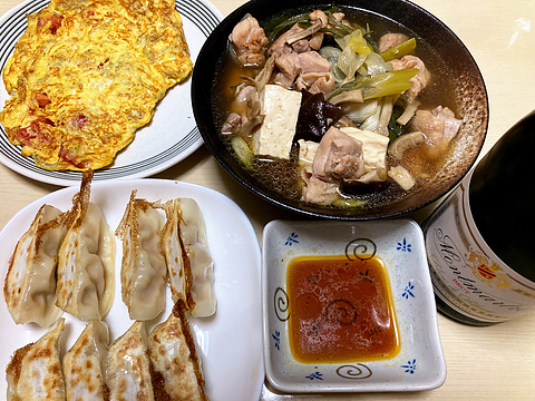 本日のメニューは、上段左からトマトとちりめんじゃこのオムレツ、鶏肉と豆腐と椎茸とネギの煮物、下段が焼き餃子(市販品を焼いたもの)、です。