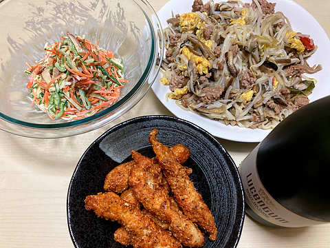 パッタイ風、他 本日のメニューは、上段左からホッキのサラダ、パッタイ風、下段がクリスピーチキン(冷凍品を揚げたもの)、です。 ==パッタイとは wikiより抜粋==タイの屋台または地元の食堂で提供される、ライスヌードルを炒めた料理である。