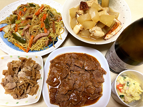 本日のメニューは、上段左からあん焼きそば、さつま揚げと冬瓜と大根の煮物、下段左から豚肉とかんぴょうの時雨煮、カルビ焼き、ポテトサラダ、です。
