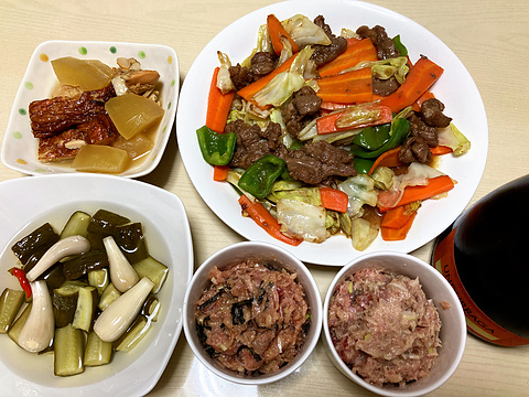 本日のメニューは、上段左からさつま揚げと冬瓜の煮物、ジンギスカン、下段左からきゅうりのらっきょう酢漬け、ネギとろ2種、です。