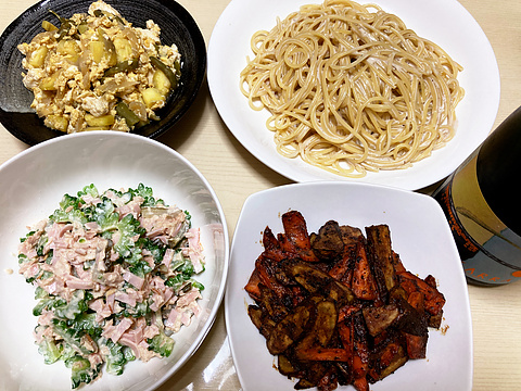 本日のメニューは、上段左からさつま芋入り炒り豆腐、ポルチーニクリームパスタ、下段左からゴーヤのツナサラダ、みそキンピラごぼう、です。