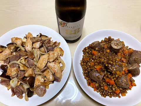 本日のメニューは、左から砂肝と椎茸のペペロンチーノソース炒め、ソーセージとレンズ豆のコンソメ煮、です。