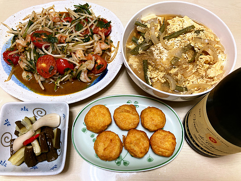 本日のメニューは、上段左から海老とトマトともやしのカレー炒め、豆腐とインゲンの玉子とじ、下段左からきゅうりのらっきょう酢漬け、チキンナゲット(冷凍品を揚げたもの)、です。