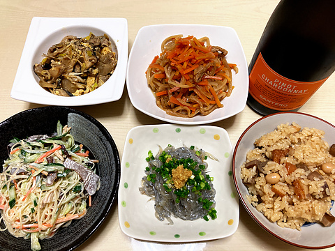 本日のメニューは、上段左から鶏レバーときのことザーサイの玉子炒め、切干大根の煮物、下段左から春雨のマヨサラダ、生シラウオ、五目豆のおこわ、です。