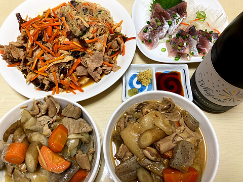 本日のメニューは、上段左からチャプチェ、アジの刺身、下段左から塩もつ煮、みそもつ煮、です。