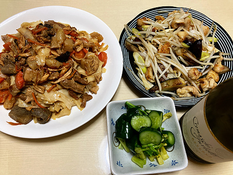 本日のメニューは、上段左からホルモン焼き刀削麺、鶏皮のナスもやし炒め、下段がきゅうりと大根葉の浅漬け、です。