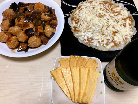 本日のメニューは、上段左からつくね団子とナスの甘酢炒め、キャベツのもちチーズ焼き、下段が玉子焼きの切り落とし(市販品)、です。