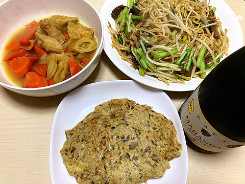 本日のメニューは、上段左からさつま揚げとにんじんのカレー煮、もやしとカブの葉の麻婆茄子焼きそば、下段が卯の花玉子焼き、です。