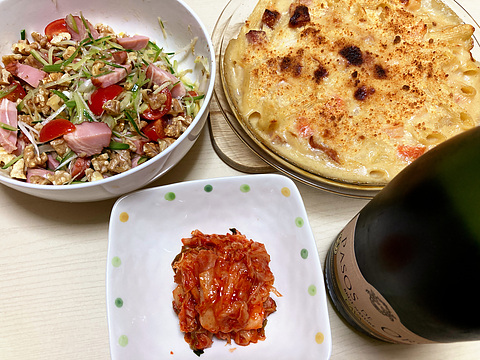 本日のメニューは、上段左からねぎチャーシュー、海老グラタン、下段がキムチ(市販品)、です。