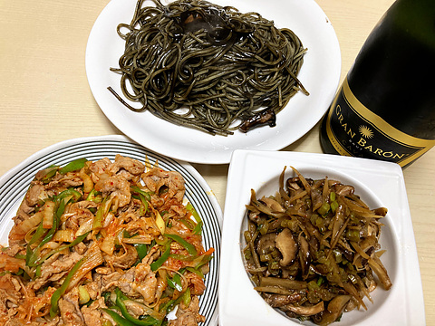 本日のメニューは、上段がイカ墨のパスタ、下段左から豚キムチ、椎茸と大根葉入りきんぴらごぼう、です。