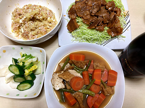 本日のメニューは、上段左かららっきょうタルタルソース入りポテトサラダ、牛カルビ炒め、下段左から自家製浅漬け、厚揚げとにんじんとインゲンの煮物、です。