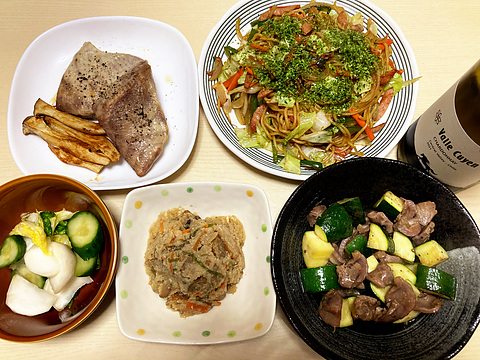 本日のメニューは、上段左からサメの塩麹漬け焼きと焼きエリンギ、ソース焼きそば、下段左から自家製浅漬け、卯の花、砂肝とズッキーニの塩炒め、です。