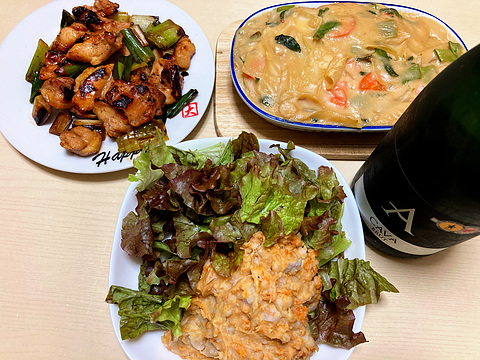 本日のメニューは、上段左からねぎまの焼き鳥、鮭の白子入りグラタン、下段が里芋の鮭めんたい和え、です。