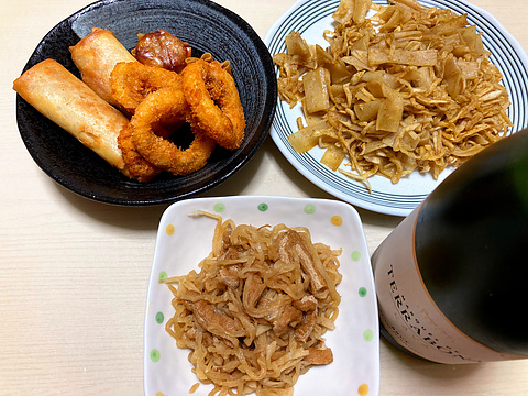 本日のメニューは、上段左から揚げ物各種(冷凍品を揚げたもの)、かんぴょうと切り干し大根のカレー炒め、下段が切り干し大根の煮物、です。