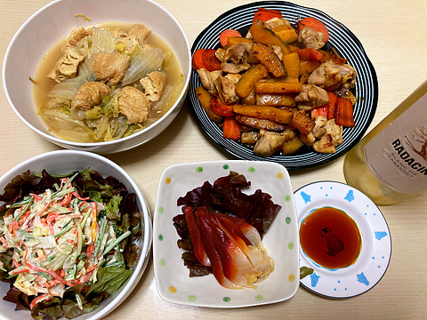 本日のメニューは、上段左から湯葉と白菜の煮物、豚肉とかぼちゃとにんじんの塩炒め、下段左からホッキ入りサラダ、ホッキの刺身、です。