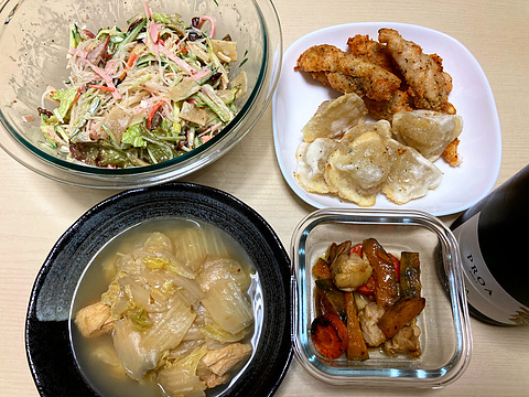 本日のメニューは、上段左からかんぴょう入り春雨サラダ、チキンバーと揚げ餃子(冷凍品を揚げたもの)、下段左から湯葉と白菜の煮浸し、鶏肉とかぼちゃの塩炒め、です。