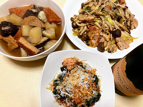 本日のメニューは、上段左からさつま揚げとハヤトウリの煮物、豚肉としめじの生姜焼き、下段がワカメとしらすの酢の物、です。