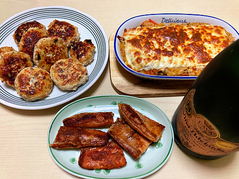 本日のメニューは、上段左からきんぴら入り鶏つくね、ミラノ風ドリア、下段が鮭ハラスのしょう油漬け焼き(冷凍品を焼いたもの)、です。