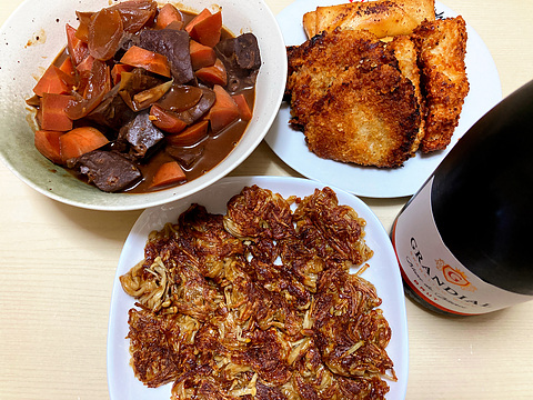 本日のメニューは、上段左から豚ふわの赤ワイン味噌煮込み、揚げ物各種(冷凍品を揚げたもの)、下段がエノキタケのパリパリ焼き、です。