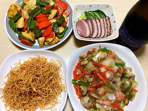 本日のメニューは、上段左から鶏胸肉とモロッコインゲンとにんじんのカレー炒め、鴨のパストラミ(市販品)、下段が皿うどん、です。