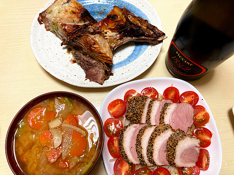 本日のメニューは、上段がマグロかまのオーブン焼き、下段左から海老汁、鴨のパストラミともやしのサラダ仕立て、です。