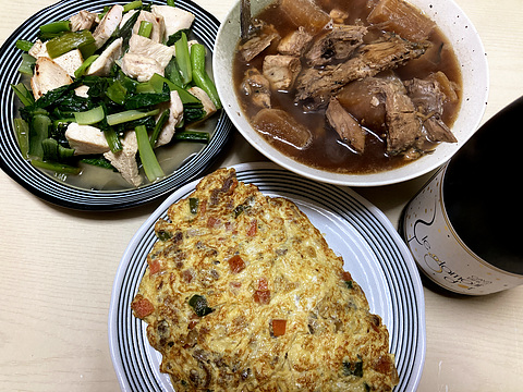 本日のメニューは、上段左から鶏胸肉と小松菜のバターソテー、ぶり大根、下段がジンギスカンのオムレツ、です。