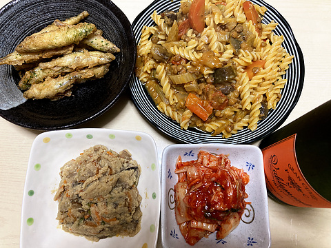 本日のメニューは、上段左からワカサギの青のりフリット(市販品)、カポナータパスタ、下段左から卯の花、キムチ(市販品)、です。