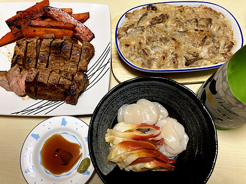 本日のメニューは、上段左から豚の塩麹漬け焼き、牛肉とレンコンとごぼうのみそグラタン、下段が貝の刺身、です。