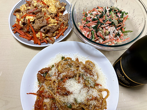 春菊とにんじんとセロリの自家製サラダチキンツナサラダ、他 本日のメニューは、上段左から豚キムチにんじん、春菊とにんじんとセロリの自家製サラダチキンツナサラダ、下段がナポリタンうどん、です。 今日は記念日なので、私あでりが作ったロールケーキが登場です。