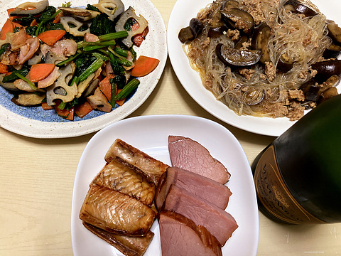 本日のメニューは、上段左からほうれん草と根菜のベーコンバターしょう油炒め、麻婆なす春雨、下段がハラス焼きと焼き豚(市販品を焼いたもの)、です。