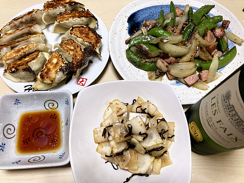 本日のメニューは、上段左から焼き餃子(自家製と市販品半々)、オイルサーディンとスナップエンドウのソテー、下段がカブの塩昆布和え、です。