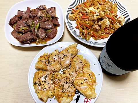 本日のメニューは、上段左から豚ハツのネギ塩炒め、豚キムチ、下段が鶏ササミのピカタ、です。