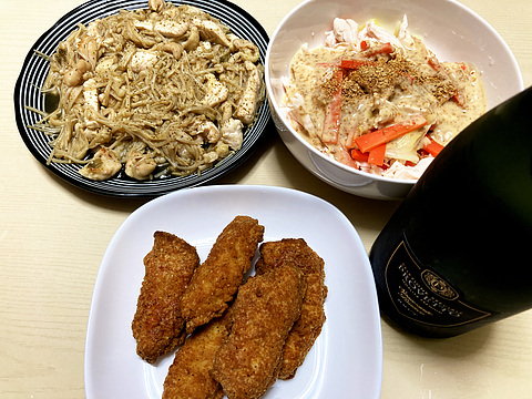 本日のメニューは、上段左から鶏皮とエノキタケのしょう油炒め、自家製サラダチキンの胡麻ドレサラダ、下段がチキンバー(冷凍品を揚げたもの)、です。