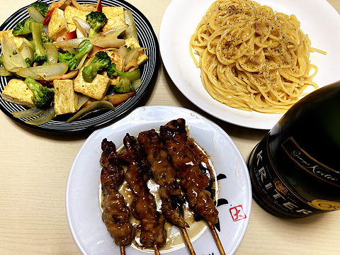 本日のメニューは、上段左から豆腐とホッキ貝とブロッコリーのカレーバターしょう油炒め、カルボナーラパスタ、下段が焼き鳥(冷凍品を焼いたもの)、です。