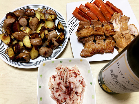 本日のメニューは、上段左からジャーマンさつまいも、豚肉と鶏肉とにんじんのみそ漬け焼き、下段がカブの梅和え、です。