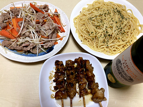 本日のメニューは、上段左から肉もやし炒め、瀬戸内レモン風味パスタ(市販品のパスタソース使用)、下段が焼き鳥(冷凍品を焼いたもの)、です。