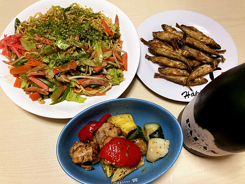 本日のメニューは、上段左からソース焼きそば、ワカサギのから揚げ(市販品)、下段が鶏肉と野菜のグリル(市販品)、です。