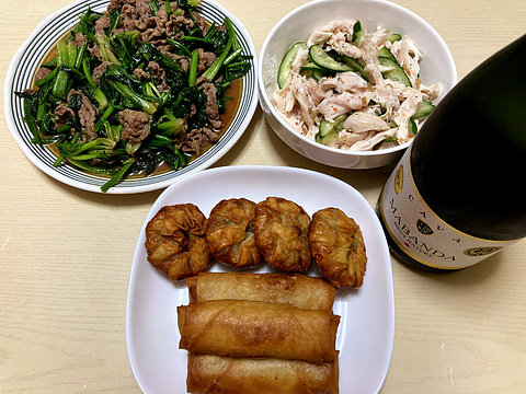 本日のメニューは、上段左から牛肉とほうれん草のXO醬炒め、自家製サラダチキンときゅうりのイタリアンドレッシングサラダ、下段が揚げニラまんじゅうと春巻き(冷凍品を揚げたもの)、です。